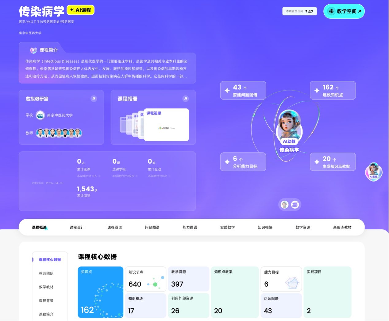 我校以“AI+课程”为核心,联合相关教育平台,第一期建设18门智慧课程,涵盖中医、药学、护理、基础医学等多个领域。通过构建知识图谱、问题图谱、目标图谱,打造结构化、可视化的课程体系,实现知识点精准关联、学习路径智能推荐、教学评价动态分析。智慧课程是教学数字化转型的关键,以学生为中心,融合中医特色,培育新时代中医药复合型人才。