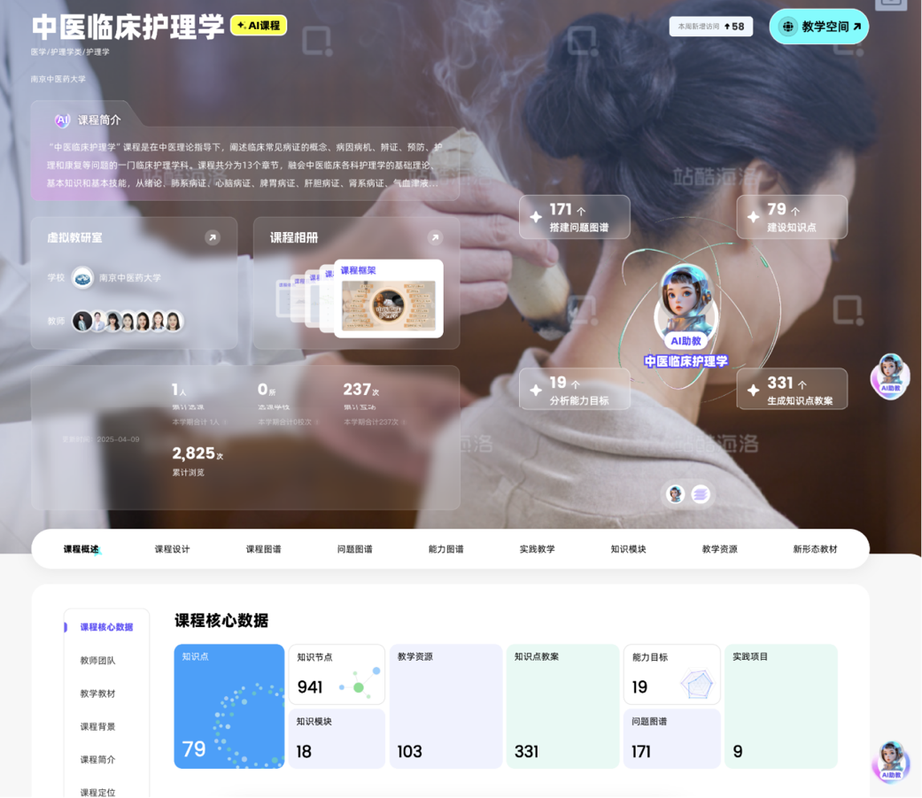 作为首批智慧课程的代表,《中医临床护理学》以“知识地图”为核心,系统整合中医整体观念与辨证施护理论,构建肺系、心脑、脾胃等六大病证护理模块。课程创新“角色扮演+案例讨论”实践教学模式,通过虚拟问诊场景模拟,帮助学生掌握中医护理技能。同时,课程深度融入“课程思政”,以中医抗疫事迹、护理文化典故激发学生的家国情怀与专业使命感。AI助教提供24小时答疑服务,助力学生精准定位薄弱环节,学习效率将大大提高。