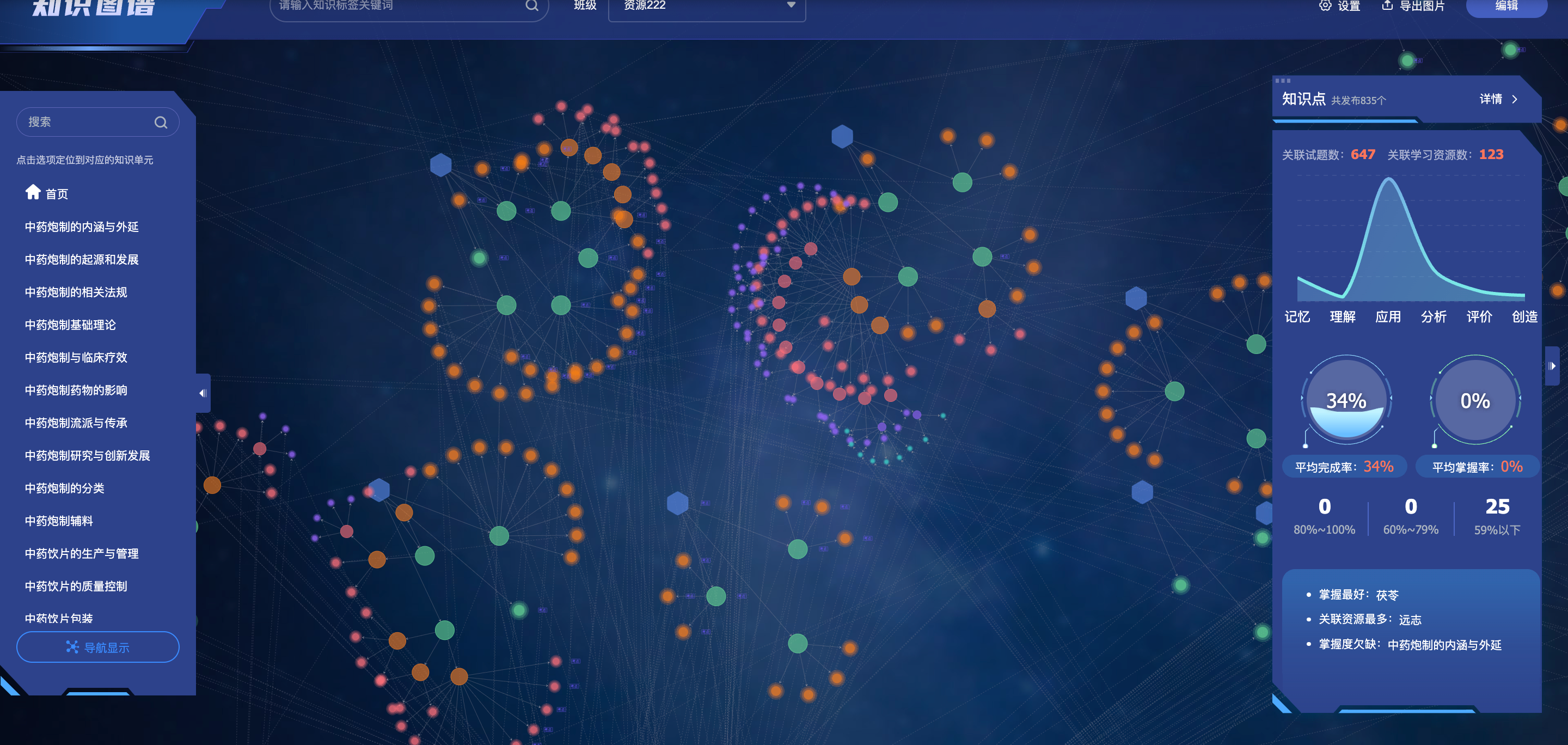 《中药炮制学》将教学内容拆解为30个模块、648个核心知识点,构建7层知识层级。课程依托“图谱引擎”,动态展示炮制工艺与药材功效的关联,例如“炒制火候对药性的影响”可视化分析。AI助教基于810+份资源训练,可实时推送炮制古籍、实验视频等拓展内容。学生知识图谱完成率超70%,重点章节掌握率达95%,传统技艺在数字化中焕发新生。