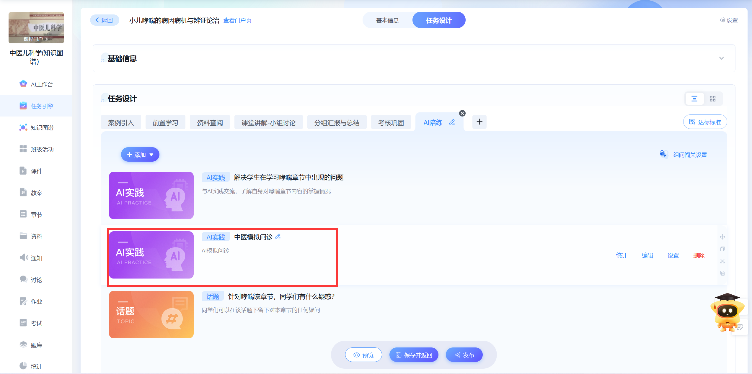 课程以“经典理论→方剂应用→辨治实战”为主线,融合《黄帝内经》等古籍精髓与现代儿科诊疗技术。知识图谱细化为115个核心知识点,引入“任务引擎”设计,如“小儿哮喘病因病机”案例分析,学生需通过虚实结合的任务完成辨证论治全流程。课程还打造“中医儿科智能体”,模拟真实问诊场景,AI助教提供个性化学习路径推荐,助力学生贯通古今、学以致用。