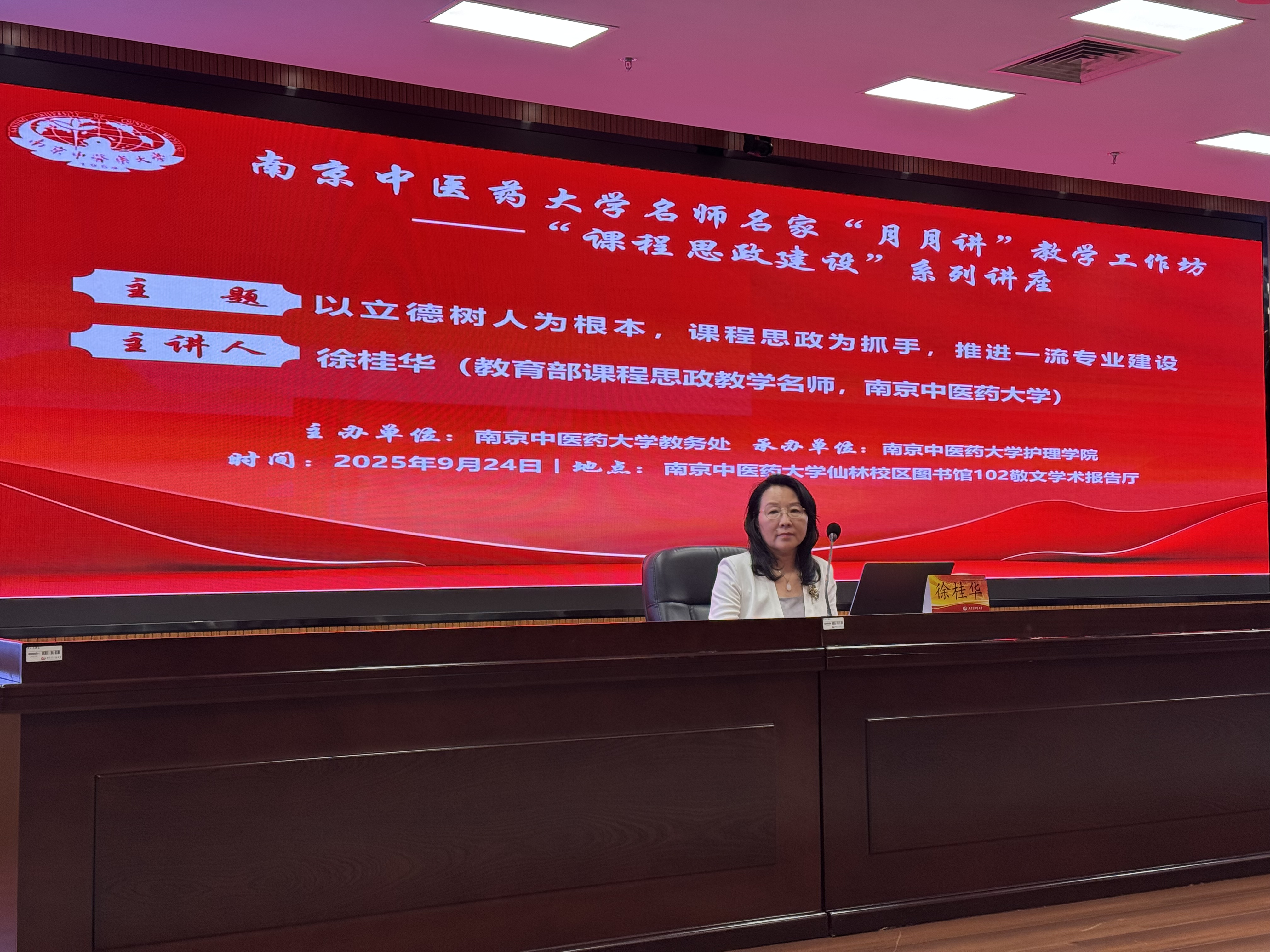 徐桂华以《以立德树人为根本,课程思政为抓手,推进一流专业建设》为题作报告。她从顶层设计、建章立制、推进举措等方面,介绍了学校在课程思政建设方面所开展的探索及成果,并以教育部课程思政示范课程、国家一流本科课程“中医临床护理学”为例,从内化课程思政理念、明确课程思政目标、建设课程思政案例库、重塑课程思政教学大纲、创新课程思政实践、评价课程思政成效等6个方面,详解介绍了课程思政设计建设路径与成效。