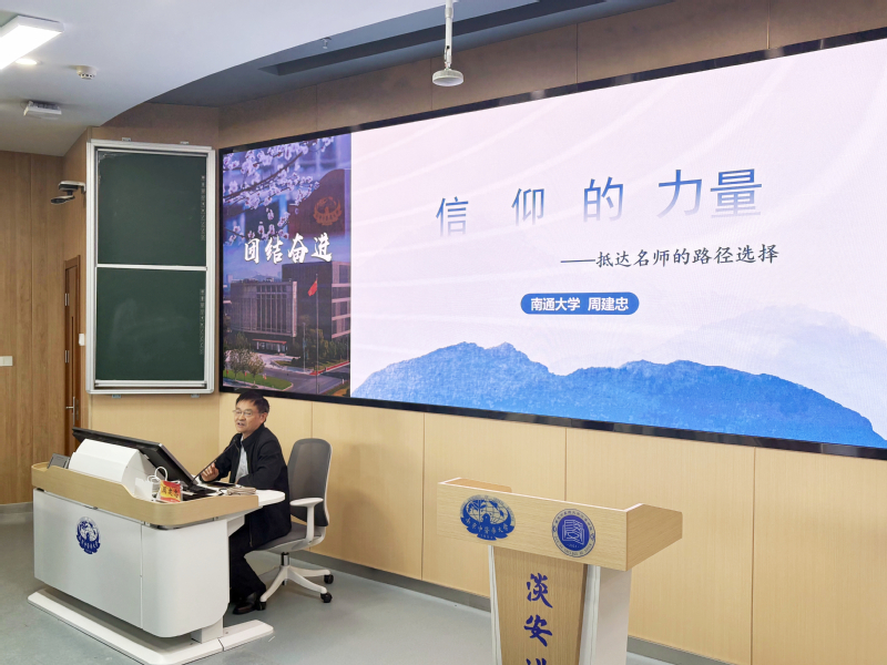 本次工作坊特别邀请国家万人计划教学名师、南通大学周建忠教授担任主讲嘉宾。周教授以《信仰的力量——抵达名师的路径选择》为题,结合其丰富的教学和管理经验,从时代挑战、学院运行、教师职业、课程建设四大方面展开分享。他以《形成中的学科》等教育与科学领域的荐读书目为切入点,引导教师深入思考人工智能时代教育变革的方向与教师角色的核心内涵。周教授用“有深度的编剧、有主见的导演、有内涵的演员、有层次的专家”生动阐释了教师的角色要义,为在场教师实现专业成长提供指导。