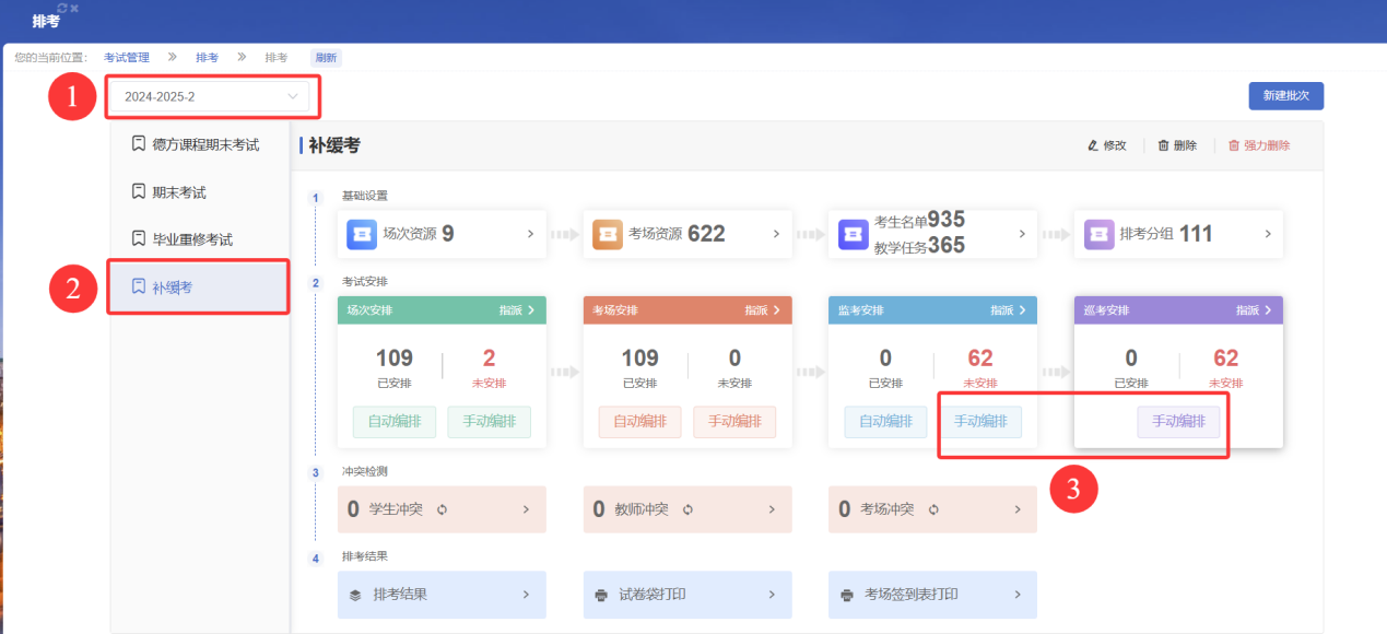 菜单位置:排考—选择“2025-2026-1学期”—“补缓考”批次,监考安排和巡考安排点击手动编排进入到编排页面。有以下两种编排方式,编排完成点击提交方可导出相应的安排表。