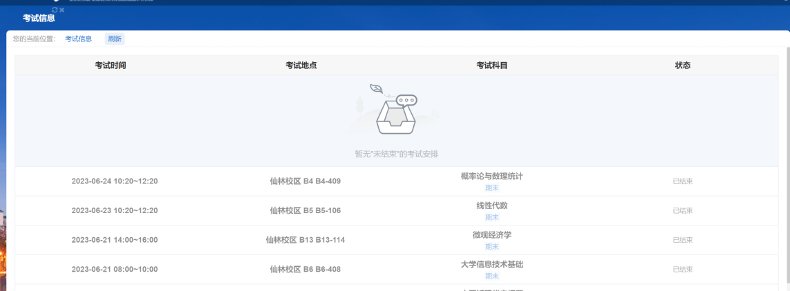 学生点击“考试信息”,进入考试信息页面,可查看具体考试的科目及考试相关信息。请学生务必于课程考试前一天再次登录系统查看考试的最新日程安排以确保考试信息的准确性。