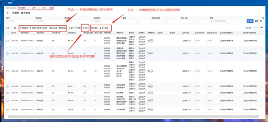 菜单位置:排考-选择2022-2023-1学期-选择补缓考批次,监考安排点击手动编排进入到编排页面。有以下两种编排方式,编排完成点击提交方可导出相应的安排表。