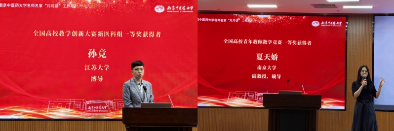全国高校教师教学创新大赛一等奖获得者、江苏大学孙竞教授,全国高校青年教师教学竞赛一等奖获得者、南京大学夏天娇教授应邀作专题分享,校中医学院唐德才教授主持专题访谈。孙竞立足“思、研、创、践”四维创新体系,倡导以赛促教,为新医科教学改革提供实践智慧;夏天娇系统解析青教赛备赛策略,通过“精研课堂—竞赛淬炼—反哺教学”闭环路径,诠释了“以赛精艺、以教育人”的师者匠心。与会嘉宾围绕“竞赛驱动发展”“教研深度融合”“育人使命传承”三大主题展开深度访谈,共话新时代教师成长的破局之道。